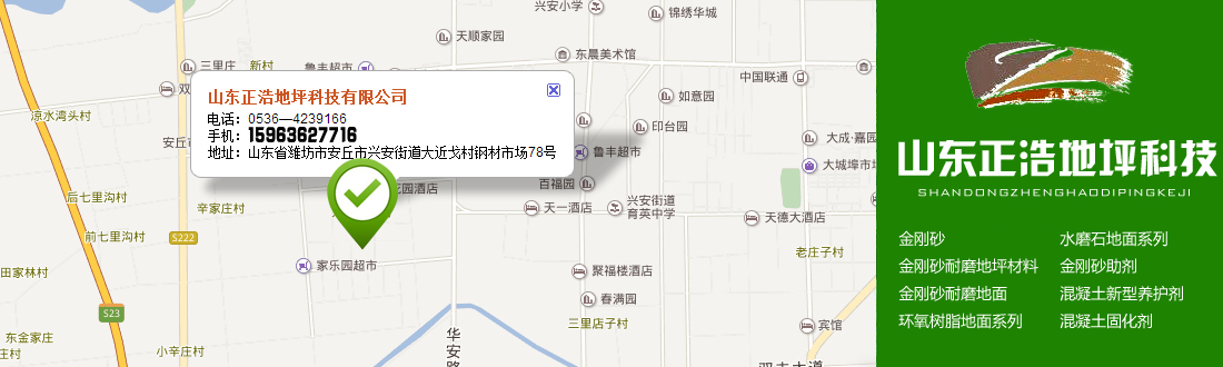 山東正浩地坪科技有限公司是從事生產銷售整體式工業廠房金剛砂耐磨地面系列 、環氧樹脂地面系列、水磨石地面系列、混凝土固化劑、金剛砂 、環氧地坪系列、防塵、美觀抗靜電高檔地坪、防腐工程的專業公司。